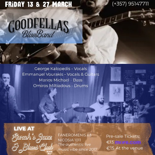 GOODFELLAS BLUES BAND AT SARAH'S 13 & 27 MAR. Faneromenis 63, Nicosia, 1011 Sarah's Jazz Club - Nicosia, Cyprus