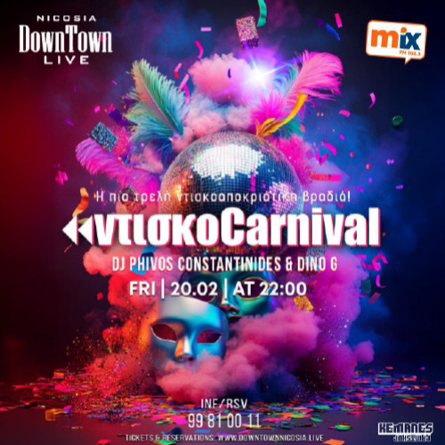 Ο Mix FM παρουσιάζει… ΝΤΙΣΚOCARNIVAL! Παρασκευή 20 Φεβρουαρίου | από τις 22:00 DownTown Live, Λευκωσία Στα decks οι DJ Φοίβος Κωνσταντινίδης και Dino G, με ελληνικούς, και όχι μόνο, ρετρό ρυθμούς καρναβαλιού που δεν θα σε αφήσουν να κάτσεις λεπτό!