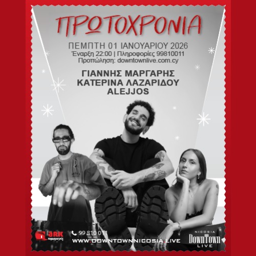 ✨ Πρωτοχρονιά στο DownTown Live! Την 1η Ιανουαρίου 2026, υποδεχόμαστε τη νέα χρονιά με μια ξεχωριστή μουσική βραδιά παρέα με τους Γιάννη Μαργάρη, Κατερίνα Λαζαρίδου και Alejjos! Τρία μοναδικά μουσικά στυλ, μια σκηνή, και μια βραδιά που θα γεμίσει με ρυθμό, συναίσθημα και ενέργεια.