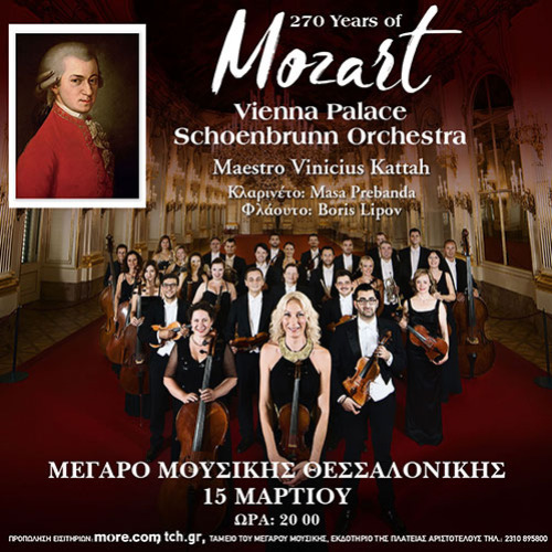 Η Vienna Schoenbrunn Palace Orchestra θα μας ταξιδέψει στους αυθεντικούς ήχους του 18ου αιώνα με τις μαγευτικές μελωδίες του Mozart, υπό τη μουσική διεύθυνση του μαέστρο Vinicius Kattah, μόνιμου συνεργάτη της Ορχήστρας και της Vienna State Opera, ο οποίος έχει ειδικευτεί στο έργο του μεγάλου συνθέτη.