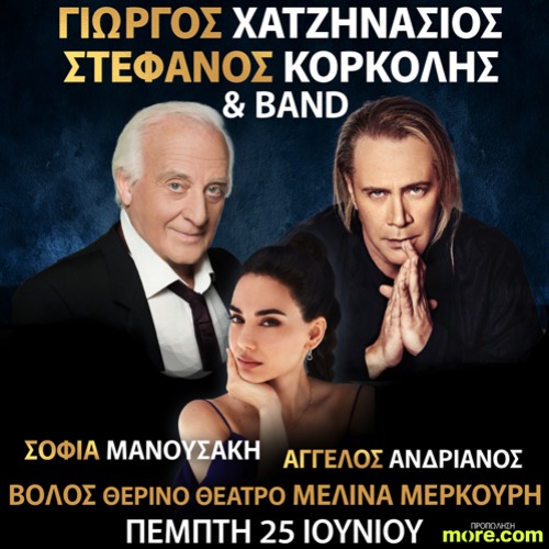 ΓΙΩΡΓΟΣ ΧΑΤΖΗΝΑΣΙΟΣ - ΣΤΕΦΑΝΟΣ ΚΟΡΚΟΛΗΣ - ΣΟΦΙΑ ΜΑΝΟΥΣΑΚΗ & BAND | ΒΟΛΟΣ Πλατεία Ρήγα Φεραίου Δημοτικό Θέατρο Μελίνα Μερκούρη - Βόλος, Μαγνησία