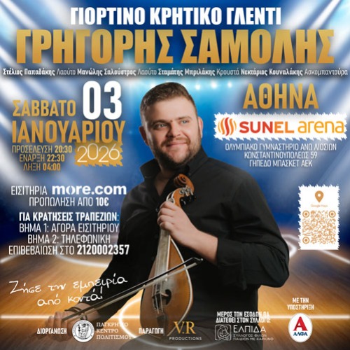 Γρηγόρης Σαμόλης - Γιορτινό Κρητικό γλέντι στην Αθήνα στο Sunel Arena Κωνσταντινουπόλεως 59 Sunel Arena - Γήπεδο Μπάσκετ ΑΕΚ - Άνω Λιόσια, Αττική