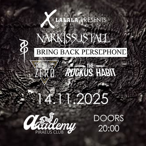 Narkissus Fall • Bring Back Persephone • The Ruckus Habit • Modulus Zero live in Athens Πειραιώς 105, Αθήνα, Τ.Κ.: 118 54 Piraeus Club Academy - Αθήνα, Αττική