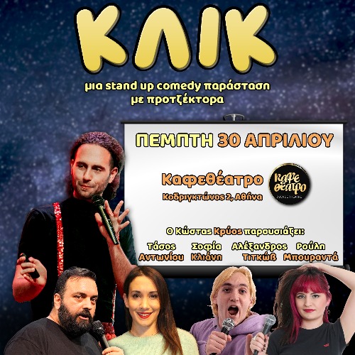 ΚΛΙΚ, μια stand up comedy παράσταση όπου τα αστεία έρχονται με την συνοδεία ενός προτζέκτορα και ενός πανιού. Το υλικό γίνεται οπτικοακουστικό και οι κωμικοί καλούνται να αποτυπώσουν τις χαζές, έξυπνες, παρανοϊκές, αστείες και σκοτεινές σκέψεις τους σε μια παρουσίαση για μια αξέχαστη βραδιά.