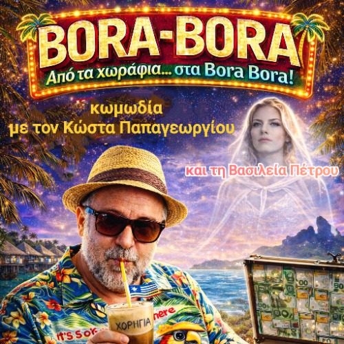 Η νέα σατιρική θεατρική παράσταση BORA-BORA του Κώστα Παπαγεωργίου αφηγείται την απίθανη ιστορία ενός Έλληνα που, έχοντας «φάει μια περιουσία», αυτοεξορίζεται στον απόλυτο τροπικό παράδεισο. Πούρο, φραπέ, ήλιος και θάλασσα. Στην Ελλάδα τον έχουν για πεθαμένο. Στα Bora Bora είναι απλώς… μόνος.