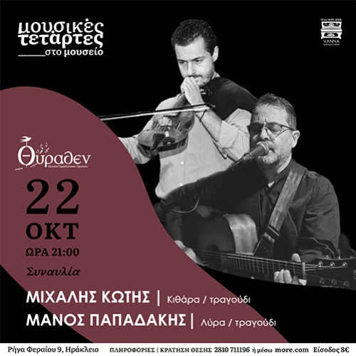 Μιχάλης Κώτης και Μάνος Παπαδάκης Πλ. Ρήγα Φεραίου, 712 01 Μουσείο Μουσικών Οργάνων «Θύραθεν» - Ηράκλειο